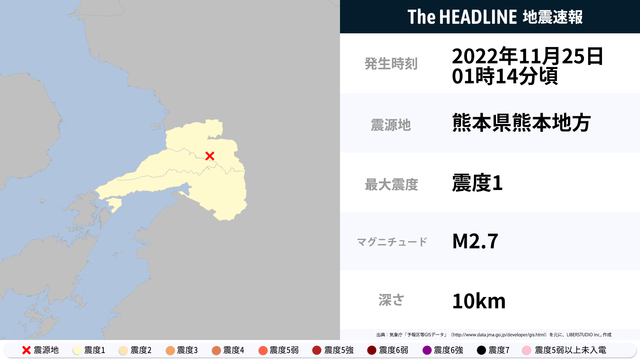 11月25日01時14分頃、熊本県熊本地方を震源とするマグニチュード2.7の地震が観測された。最大震度1を観測したのは、熊本県。