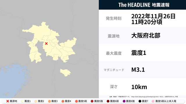 11月26日11時20分頃、大阪府北部を震源とするマグニチュード3.1の地震が観測された。最大震度1を観測したのは、京都府・大阪府など。