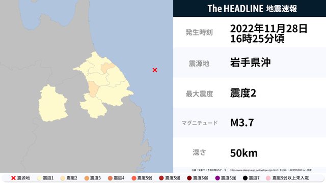 11月28日16時25分頃、岩手県沖を震源とするマグニチュード3.7の地震が観測された。最大震度2を観測したのは、青森県・岩手県。