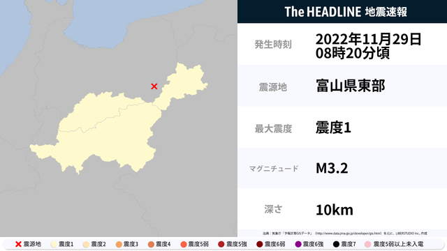 11月29日08時20分頃、富山県東部を震源とするマグニチュード3.2の地震が観測された。最大震度1を観測したのは、長野県・岐阜県。