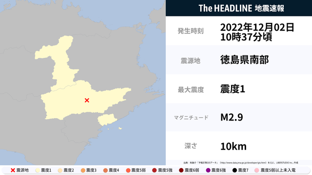 12月2日10時37分頃、徳島県で最大震度1の地震を観測