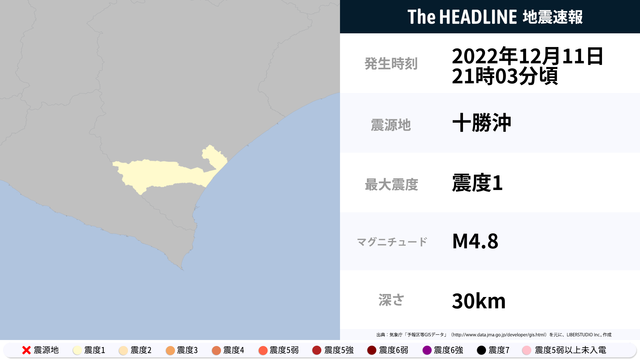 12月11日21時03分頃、十勝沖を震源とするマグニチュード4.8の地震が観測された。最大震度1を観測したのは、北海道。