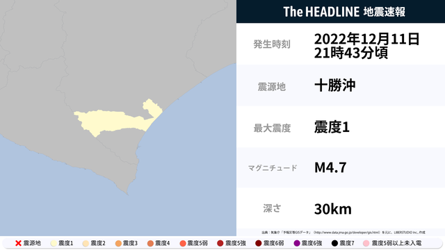 12月11日21時43分頃、十勝沖を震源とするマグニチュード4.7の地震が観測された。最大震度1を観測したのは、北海道。