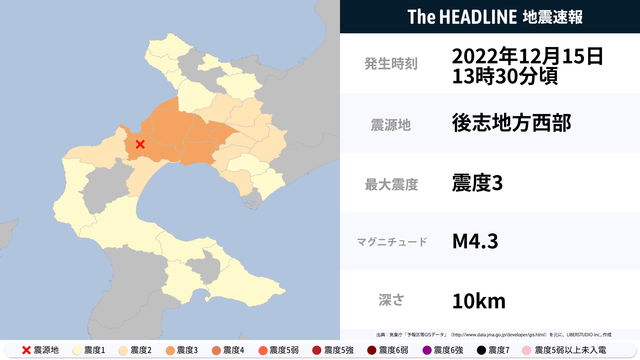 12月15日13時30分頃、後志地方西部を震源とするマグニチュード4.3の地震が観測された。最大震度3を観測したのは、北海道。