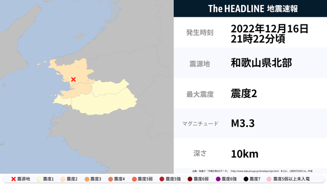 12月16日21時22分頃、和歌山県北部を震源とするマグニチュード3.3の地震が観測された。最大震度2を観測したのは、和歌山県。