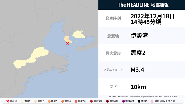 12月18日14時45分頃、伊勢湾を震源とするマグニチュード3.4の地震が観測された。最大震度2を観測したのは、愛知県。