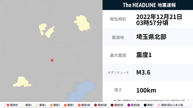 12月21日03時57分頃、埼玉県北部を震源とするマグニチュード3.6の地震が観測された。最大震度1を観測したのは、栃木県・群馬県など。