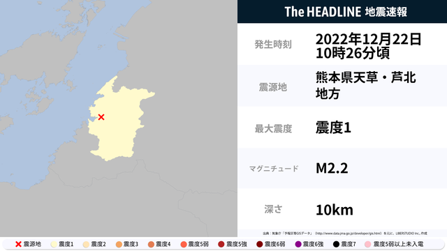 12月22日10時26分頃、熊本県で最大震度1の地震を観測