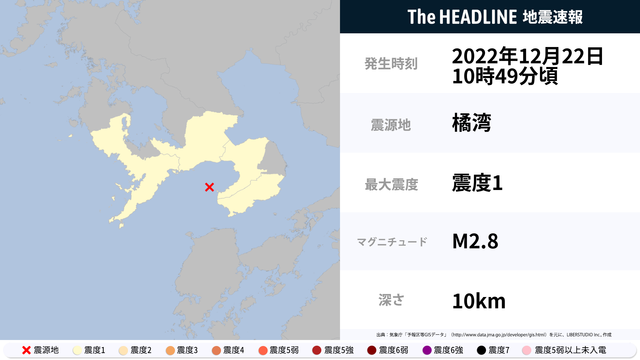 12月22日10時49分頃、長崎県で最大震度1の地震を観測