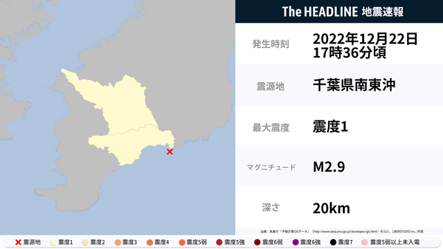 12月22日17時36分頃、千葉県南東沖を震源とするマグニチュード2.9の地震が観測された。最大震度1を観測したのは、千葉県。