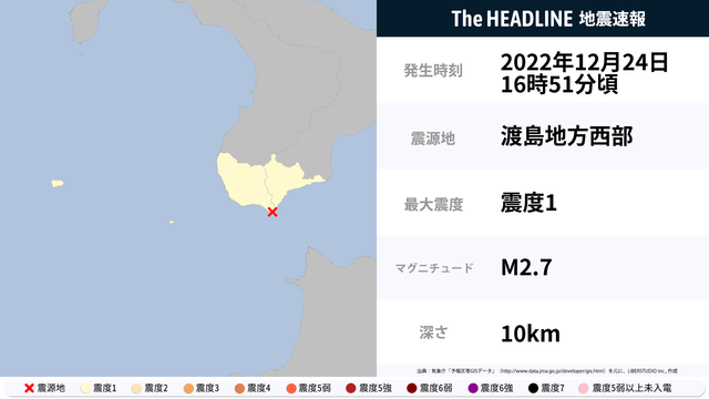 12月24日16時51分頃、渡島地方西部を震源とするマグニチュード2.7の地震が観測された。最大震度1を観測したのは、北海道。