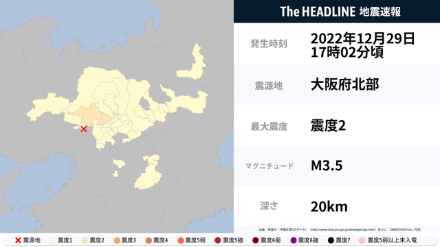 12月29日17時02分頃、大阪府北部を震源とするマグニチュード3.5の地震が観測された。最大震度2を観測したのは、京都府。