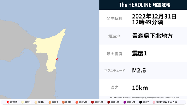 12月31日12時49分頃、青森県下北地方を震源とするマグニチュード2.6の地震が観測された。最大震度1を観測したのは、青森県。