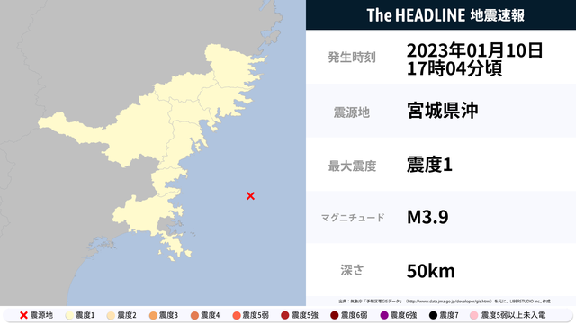 01月10日17時04分頃、宮城県沖を震源とするマグニチュード3.9の地震が観測された。最大震度1を観測したのは、岩手県・宮城県。