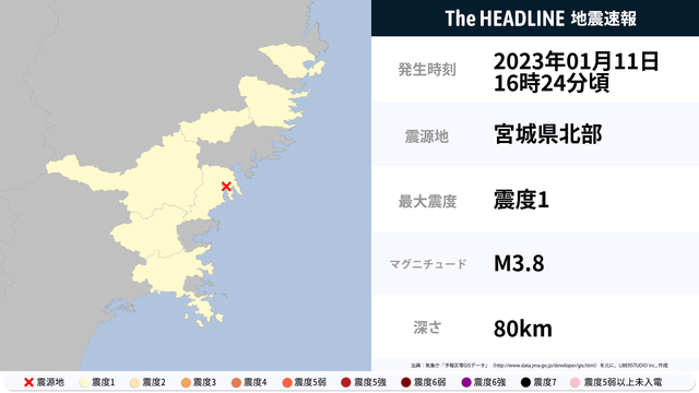 01月11日16時24分頃、宮城県北部を震源とするマグニチュード3.8の地震が観測された。最大震度1を観測したのは、岩手県・宮城県。