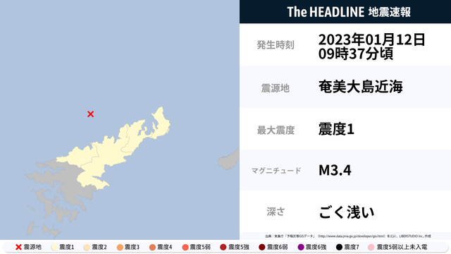 01月12日09時37分頃、奄美大島近海を震源とするマグニチュード3.4の地震が観測された。最大震度1を観測したのは、鹿児島県。