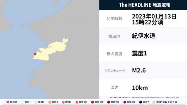 1月13日15時22分頃、和歌山県で最大震度1の地震を観測