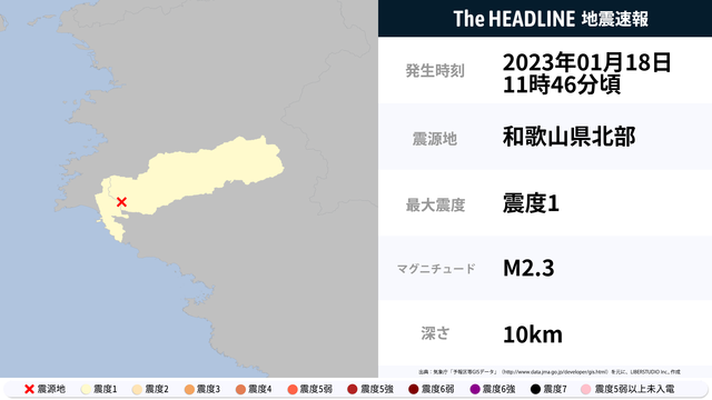 1月18日11時46分頃、和歌山県で最大震度1の地震を観測