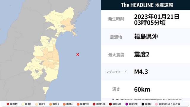 01月21日03時05分頃、福島県沖を震源とするマグニチュード4.3の地震が観測された。最大震度2を観測したのは、宮城県・福島県。