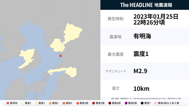 01月25日22時26分頃、有明海を震源とするマグニチュード2.9の地震が観測された。最大震度1を観測したのは、長崎県・熊本県。