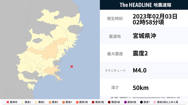 02月03日02時58分頃、宮城県沖を震源とするマグニチュード4.0の地震が観測された。最大震度2を観測したのは、岩手県・宮城県。