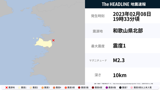 02月08日19時33分頃、和歌山県北部を震源とするマグニチュード2.3の地震が観測された。最大震度1を観測したのは、和歌山県。