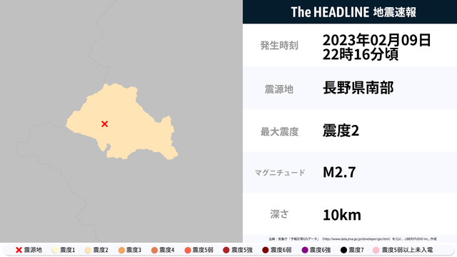 2月9日22時16分頃、長野県で最大震度2の地震を観測