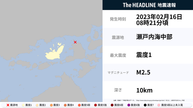 02月16日08時21分頃、瀬戸内海中部を震源とするマグニチュード2.5の地震が観測された。最大震度1を観測したのは、広島県。