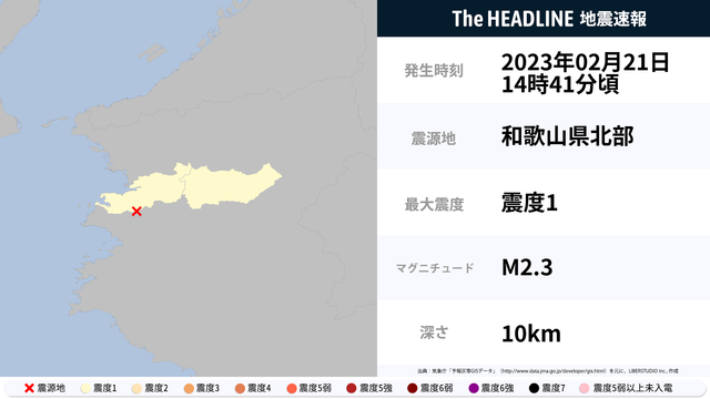 2月21日14時41分頃、和歌山県で最大震度1の地震を観測