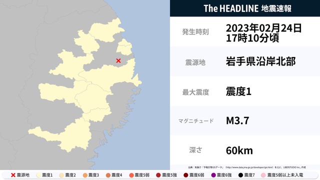 2月24日17時10分頃、岩手県で最大震度1の地震を観測