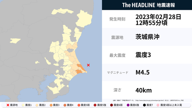 02月28日12時55分頃、茨城県沖を震源とするマグニチュード4.5の地震が観測された。最大震度3を観測したのは、茨城県・千葉県。