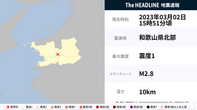 3月2日15時51分頃、和歌山県で最大震度1の地震を観測