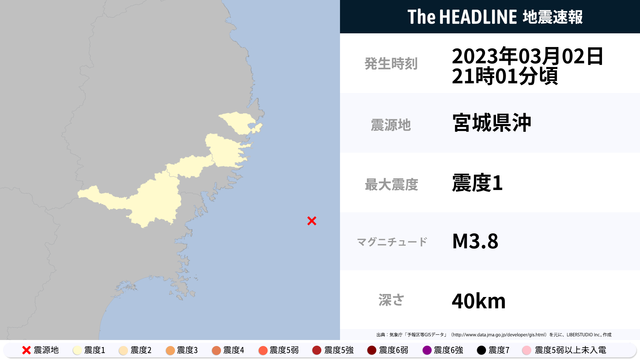 03月02日21時01分頃、宮城県沖を震源とするマグニチュード3.8の地震が観測された。最大震度1を観測したのは、岩手県。