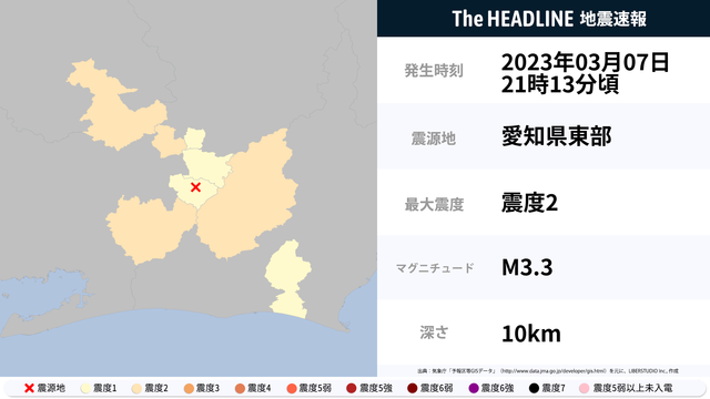 03月07日21時13分頃、愛知県東部を震源とするマグニチュード3.3の地震が観測された。最大震度2を観測したのは、長野県・岐阜県など。
