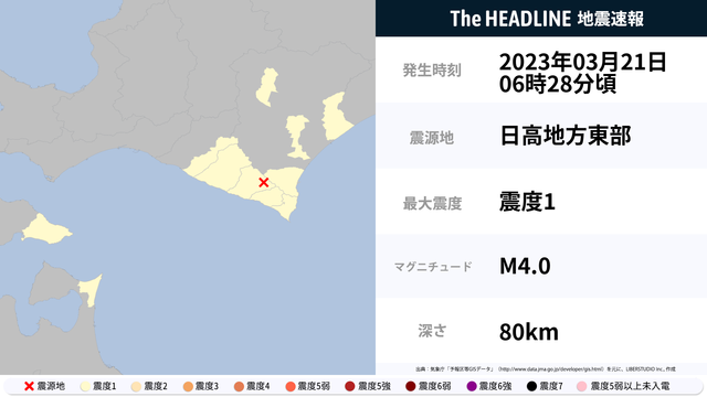 03月21日06時28分頃、日高地方東部を震源とするマグニチュード4.0の地震が観測された。最大震度1を観測したのは、北海道・青森県。