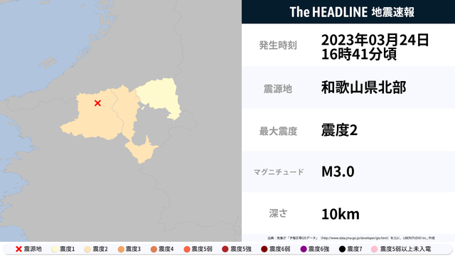3月24日16時41分頃、和歌山県で最大震度2の地震を観測
