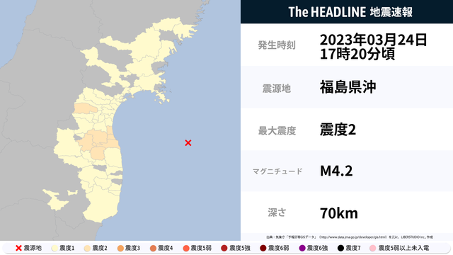 03月24日17時20分頃、福島県沖を震源とするマグニチュード4.2の地震が観測された。最大震度2を観測したのは、宮城県・福島県。