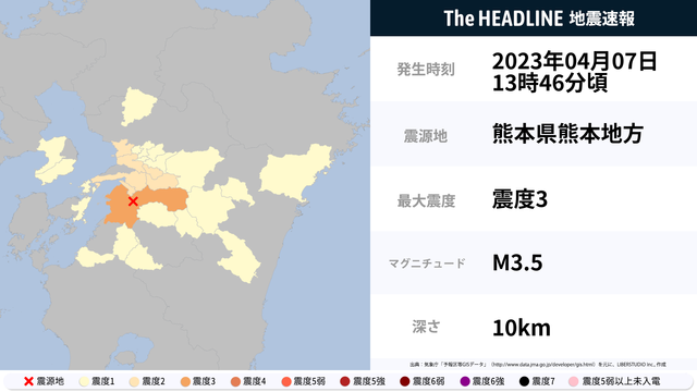 4月7日13時46分頃、熊本県で最大震度3の地震を観測