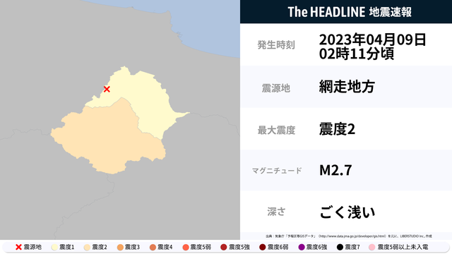 04月09日02時11分頃、網走地方を震源とするマグニチュード2.7の地震が観測された。最大震度2を観測したのは、北海道。