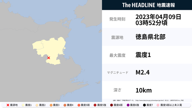 04月09日03時52分頃、徳島県北部を震源とするマグニチュード2.4の地震が観測された。最大震度1を観測したのは、徳島県。