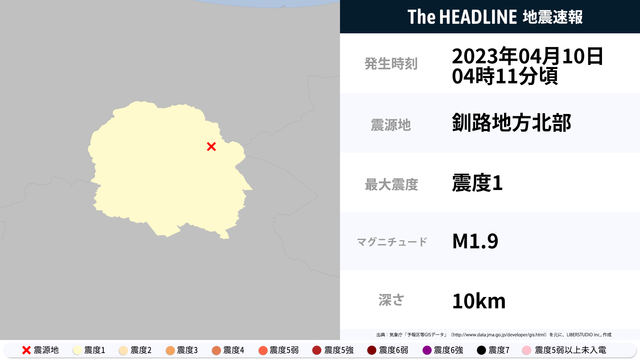 4月10日4時11分頃、北海道で最大震度1の地震を観測
