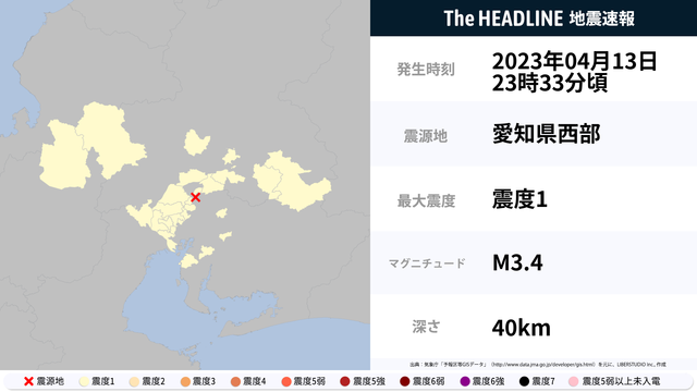 4月13日23時33分頃、岐阜県・愛知県などで最大震度1の地震を観測