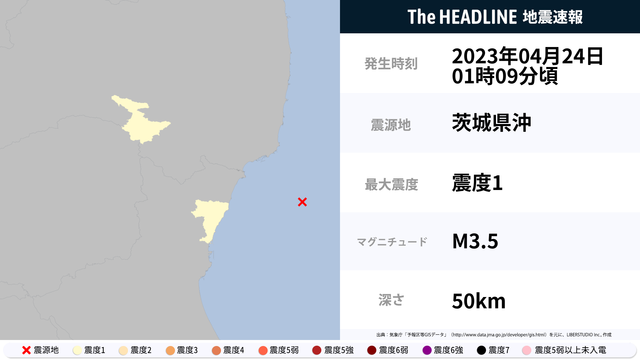 04月24日01時09分頃、茨城県沖を震源とするマグニチュード3.5の地震が観測された。最大震度1を観測したのは、福島県・茨城県。