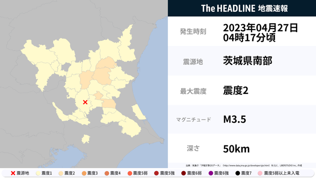 4月27日4時17分頃、茨城県で最大震度2の地震を観測
