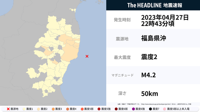 4月27日22時43分頃、福島県で最大震度2の地震を観測
