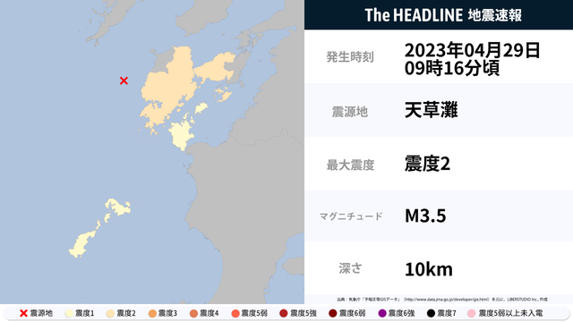 04月29日09時16分頃、天草灘を震源とするマグニチュード3.5の地震が観測された。最大震度2を観測したのは、熊本県。