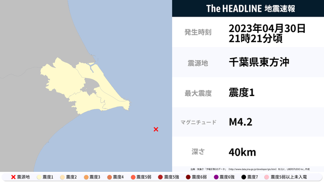 04月30日21時21分頃、千葉県東方沖を震源とするマグニチュード4.2の地震が観測された。最大震度1を観測したのは、茨城県・千葉県。