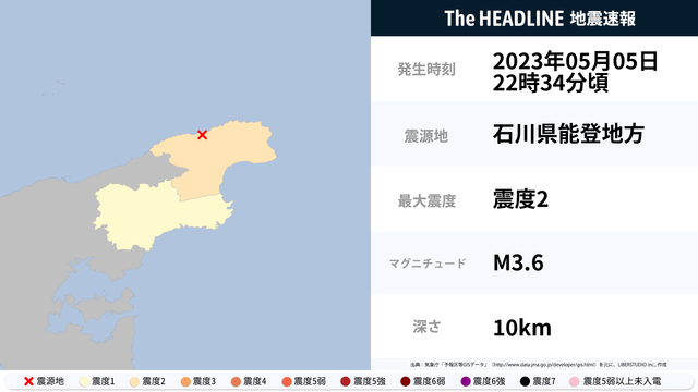 5月5日22時34分頃、石川県で最大震度2の地震を観測