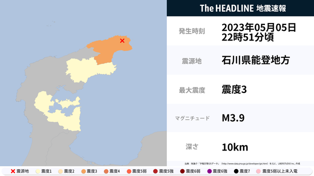 5月5日22時51分頃、石川県で最大震度3の地震を観測