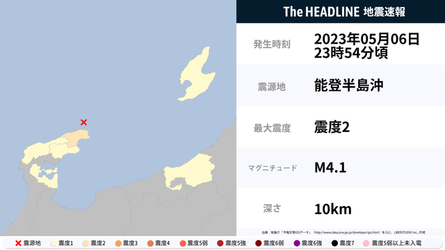 05月06日23時54分頃、能登半島沖を震源とするマグニチュード4.1の地震が観測された。最大震度2を観測したのは、石川県。